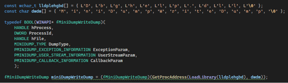 在下面的代码片段中,库“dbghelp.dll”被拆分成一个包含单个字符的数组,并读入变量“lldplehgbd”。“minidumpwritedeump”也使用了相同的混淆技术,并将其存储在名为 dwdm 的变量中。LetMeowIn 在不同领域利用了相同的混淆技术,用于常见的关键字检测。