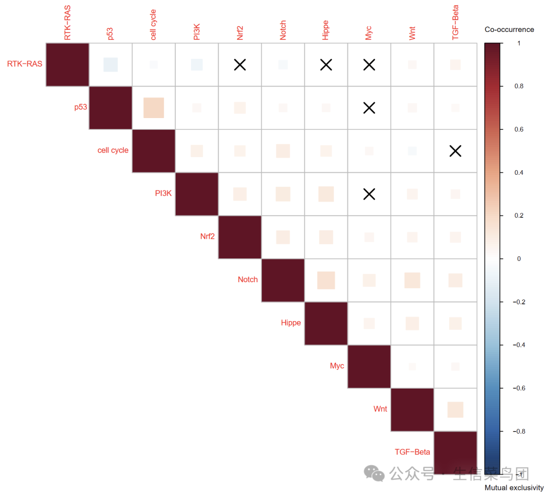 进一步研究了不同途径之间改变的相互排他性和共现性。最突出的特点是RTK-RAS通路与其他通路之间没有共存,并且发现RTK-RAS和p53/PI3K通路之间存在轻微的相互排他性,表明RTK-RAS通路的改变可以单独诱导肿瘤发生。在p53和细胞周期通路之间发现最强的共现,这些结果说明了不同途径之间的串扰,揭示了可以在治疗上探索的功能相互作用和依赖性。