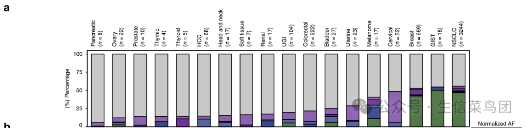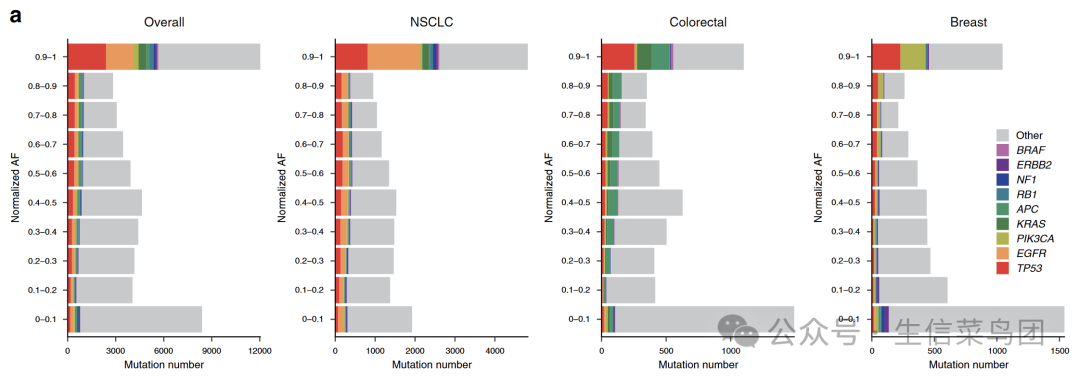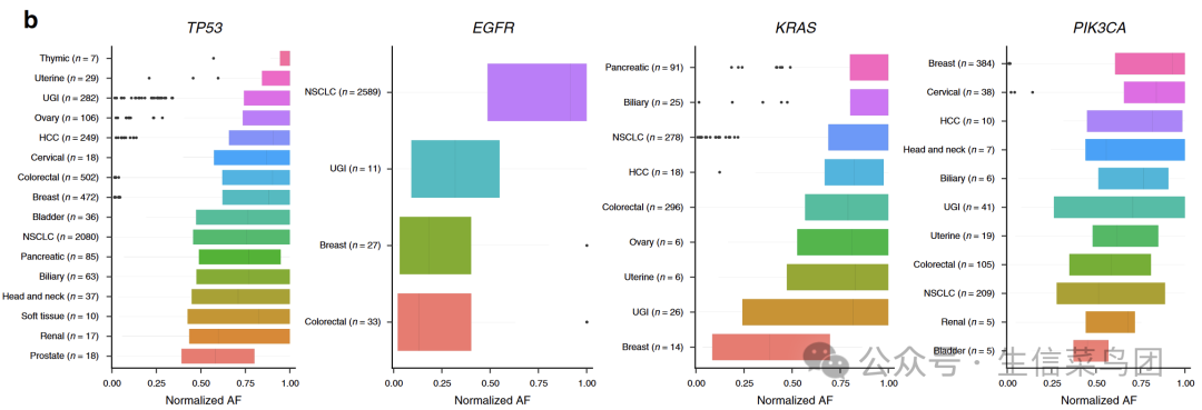MATH算法反映的ctDNA的高异质性意味着其复杂的克隆结构。考虑到大多数样本来自正在接受治疗的晚期疾病患者,ctDNA的丰度使基因组克隆性的重建成为可能。采用一种使用标准化AF量化突变克隆性的方法,并探索了它们在不同癌症类型和特定驱动基因中的分布。