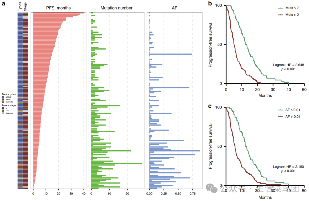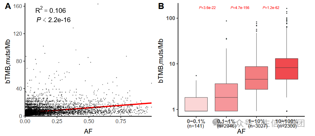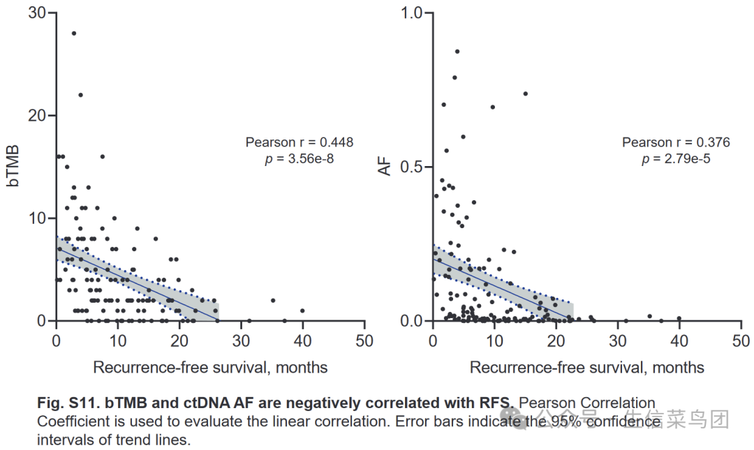 此外,bTMB与ctDNA AF呈正相关(R2=0.106,0.1也叫正相关了…样本量大导致的?),当根据ctDNA AF将样本分成不同组时,观察到bTMB呈阶梯状增加。表明AF校正的bTMB可能是一种更好的治疗标志物。