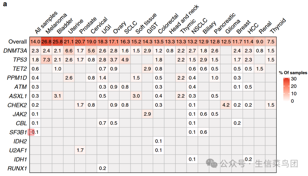 在cfDNA中追踪了在WBC中鉴定的CH变异,其中突出显示了1861个血浆样本中的2754个突变(14.0%),与CH相关的15个经典基因,包括DNMT3A、TP53、TET2和PPM1D,是最反复出现的。