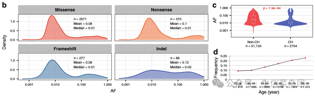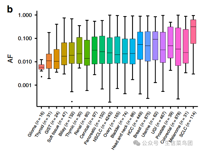 在>20%的黑色素瘤、膀胱癌、子宫癌和前列腺癌血浆样本中检测到CH变异,在<10%的肾癌和甲状腺癌样本中检测到CH变异。检测最多的CH基因因癌症类型而异。例如,TP53是黑色素瘤和SCLC中最常见的CH基因,而DNMT3A在子宫癌和宫颈癌中最常见。cfDNA中CH突变的AF分布大多数在0%到10%之间。CH突变在cfDNA中表现出的AFs显著低于非CH突变。