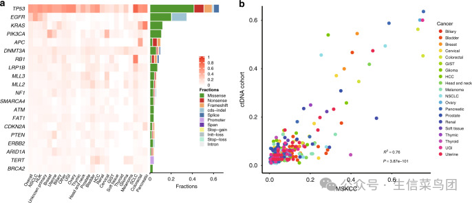 结果及结论:使用血浆和白细胞之间的平行测序,14%的浆细胞游离DNA样品包含CH变异,其可检测性随着年龄的增长而增加(在另外一个超深度60000X的文章中显示有53%左右CH变异)。消除CH变异后,在73.5%的血浆样本中检测到ctDNA,其中小细胞肺癌(91.1%)和前列腺癌(87.9%)的可检测性最高。ctDNA分析揭示的驱动基因频率与基于组织的数据库中相似(R2=0.87,p<0.001), 但也有一些差异,例如非小细胞肺癌中较高的EGFR(44.8% vs 25.2%) 和较低的KRAS频率(6.8% vs 27.2%),以及较高的肝癌TP53(53.1% vs 28.6%)。高达41.2%的血浆样本具有药物敏感性改变。