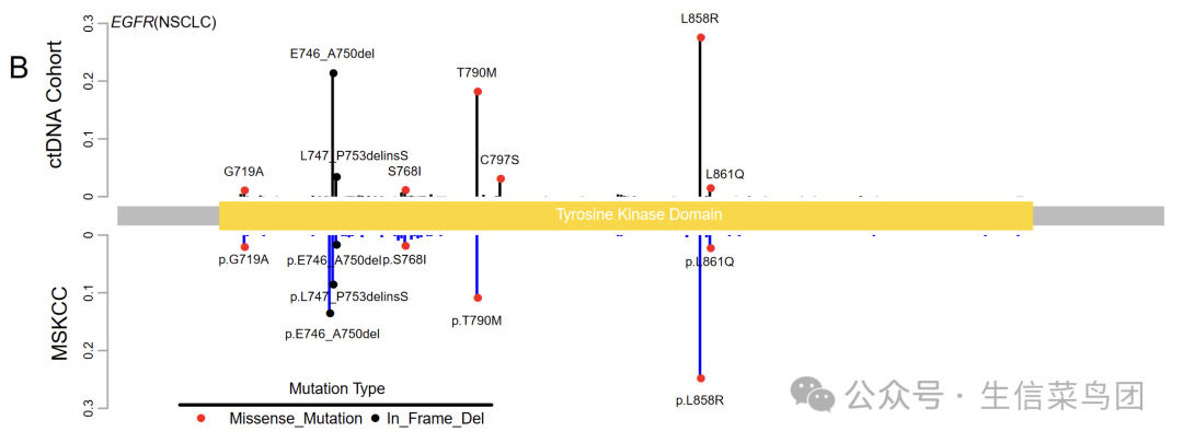 EGFR突变在NSCLC血浆样本中比在MSKCC中更常见(44.8%对25.2%),热点分布存在一些差异。例如,血浆样本中外显子19缺失(e19del)和T790M的频率较高,而介导对第三代EGFR抑制剂的耐药性的C797S仅存在于血浆样本中。