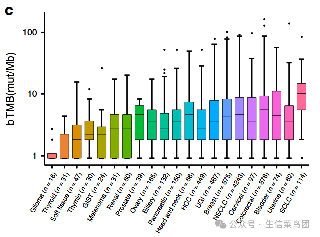 SCLC显示高血瘤突变负荷(bTMB),子宫癌、膀胱癌、结直肠癌和宫颈癌的bTMB也高于其他癌症类型。