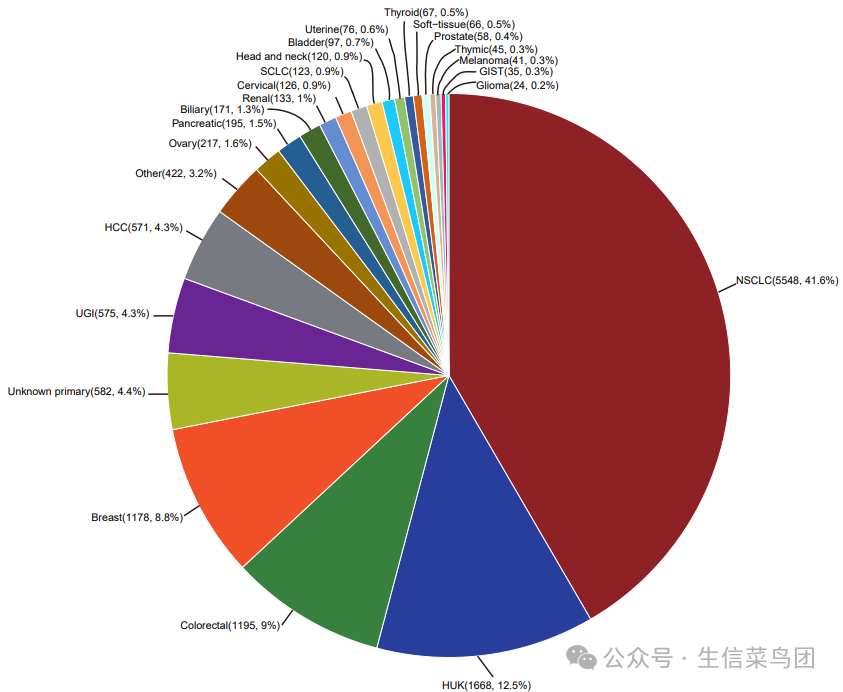 该队列包括41种主要肿瘤类型。最常见的肿瘤类型是非小细胞肺癌(NSCLC;n=5548),组织学未知肺癌的肺癌样本(HUK,n=1668)。其他常见类型包括结直肠癌(n=1195)、乳腺癌(n=1178)、上消化道癌(UGI)(n=575)和肝细胞癌 (HCC;n=571)。超过一半的样本来自转移期患者(临床IV期,7303/13,333,54.8%)。