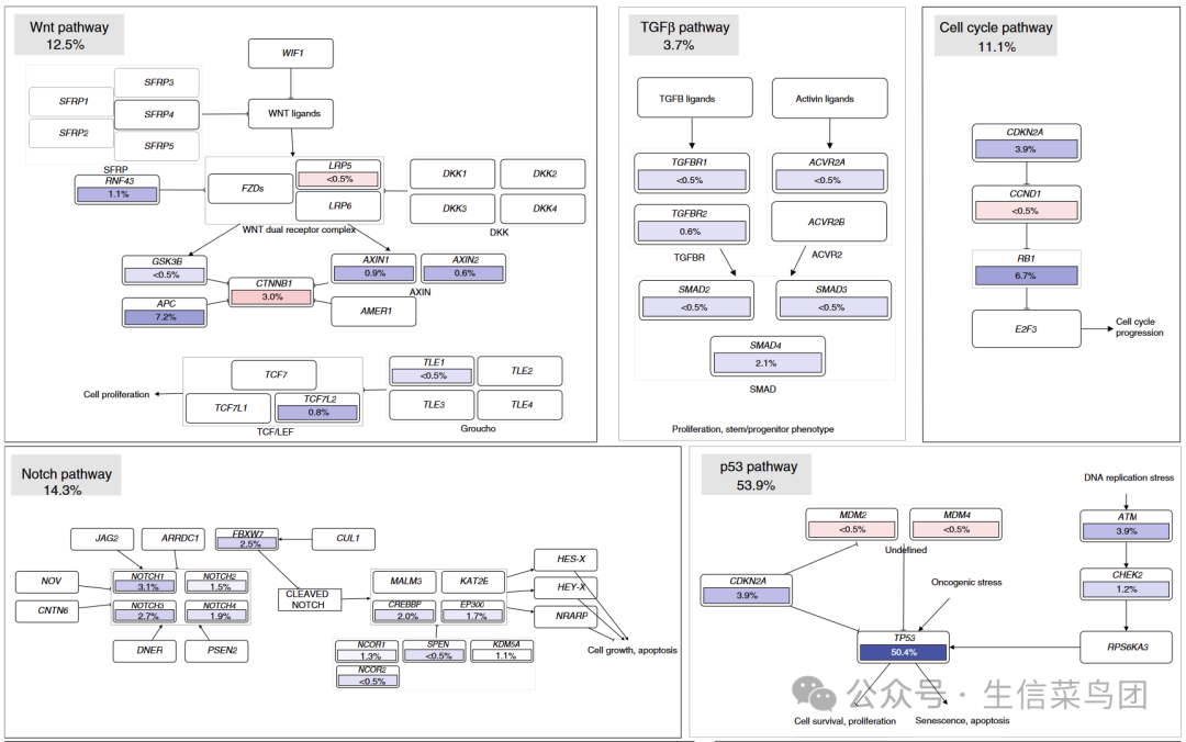 为了探索ctDNA变体的功能意义,通过为每个通路分配特定基因来评估与增殖潜力相关的 10 个经典信号通路(即细胞周期、Hippo、Myc、Notch、Nrf2、PI3K、RTK/RAS/MAPK、TGFβ、p53 和 Wnt)。RTK-RAS通路的改变频率最高(占样本的 56.1%),其次是p53(占样本的 53.9%)和PI3K(占样本的 22.8%)通路。