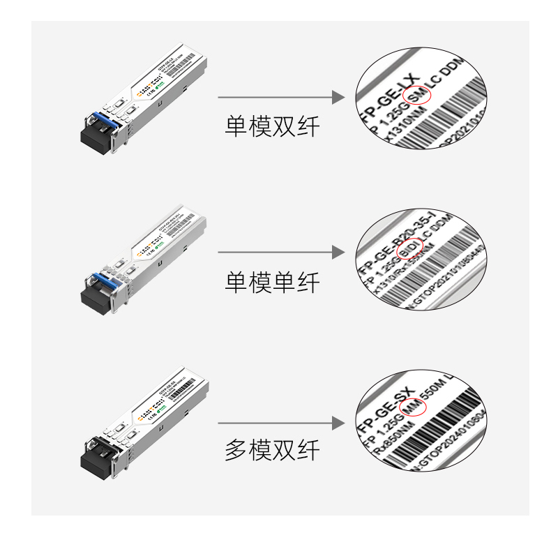 :标注“SM”(单模双纤)或“BIDI”(单模单纤)