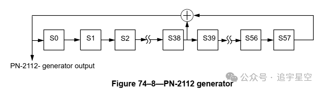 PN-2112是由多项式r(x)生成的长度为2112的伪噪声序列,初始状态S57=1,Si-1 = Si XOR 1,或者简单地说是101010的二进制序列。在每个FEC块处理(编码或解码)之前,PN-2112生成器都用这种状态进行初始化。PN-2112发生器应产生与图74-8所示实施相同的结果。这实现了方程式(74-4)中给出的PN-2112生成器多项式。