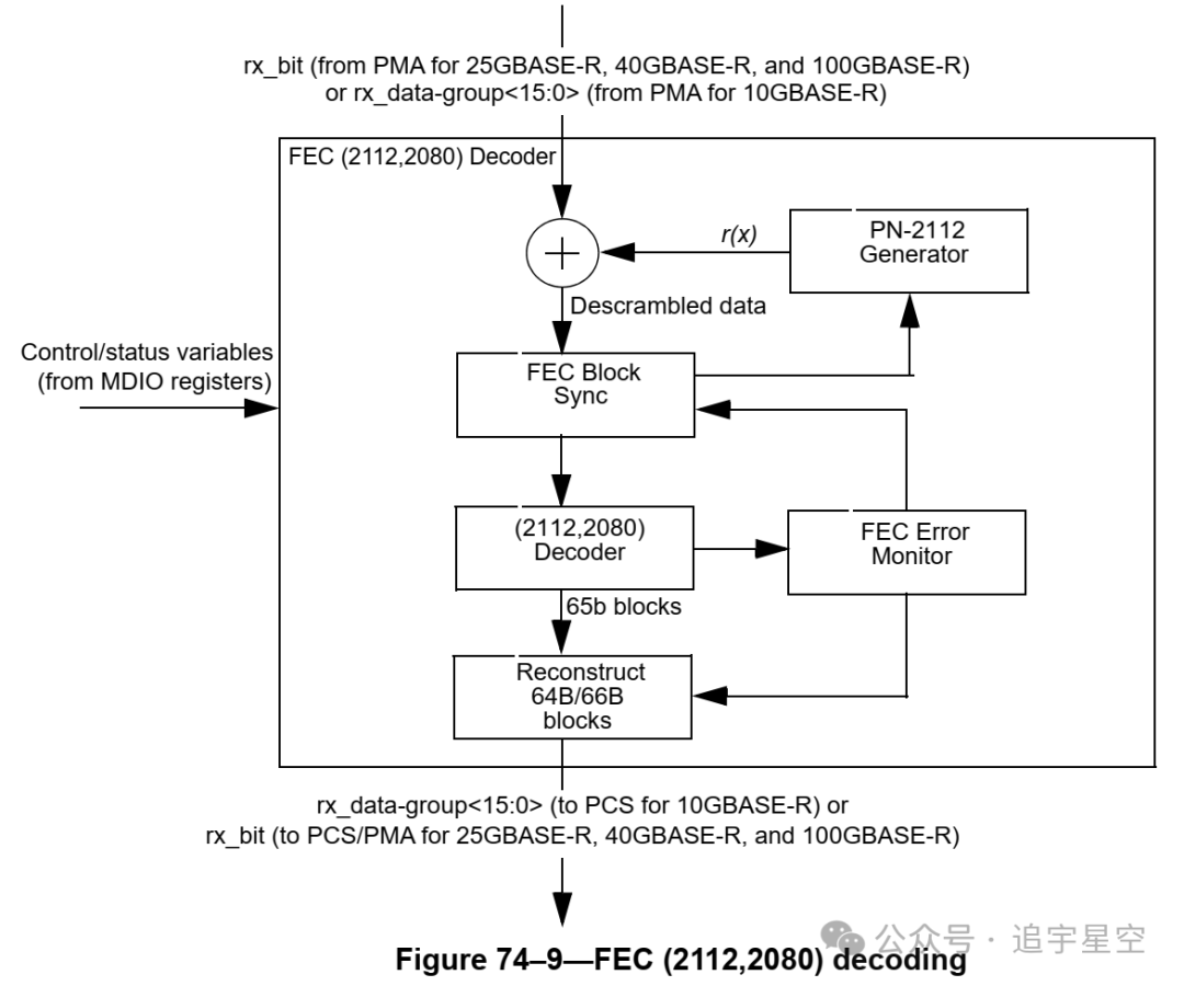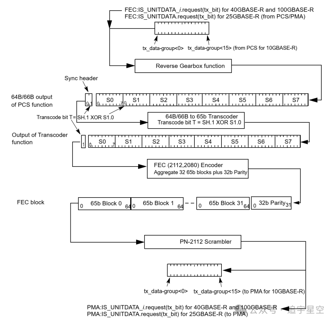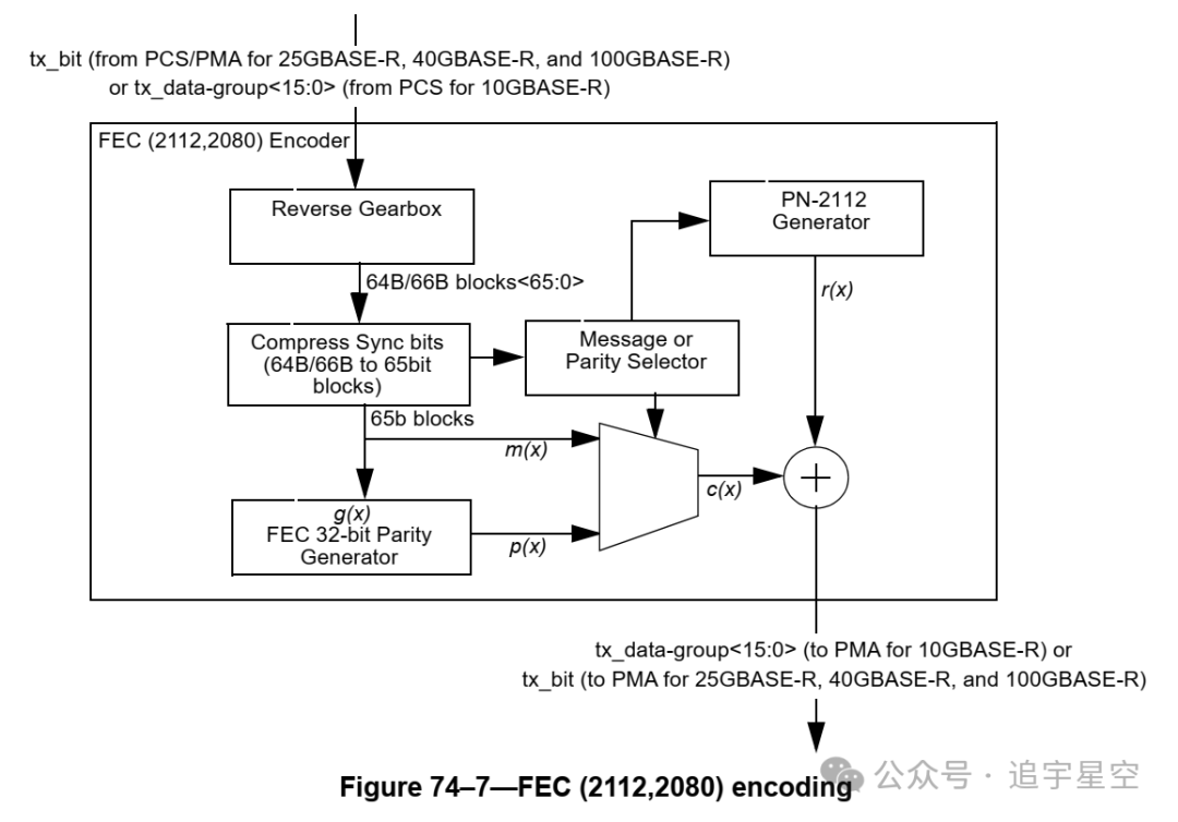 FEC编码器使用66位宽的数据路径连接到反向变速箱功能。FEC编码器从反向变速箱中提取32 × 64B/66B块,并将其编码为2112位的单个FEC块。FEC编码器将两个同步比特压缩为一个转码比特。然后,转码比特与相应64B/66B块的数据比特8进行异或运算。得到的32 × 65b = 2080位,被馈送到(2112,2080)编码器,该编码器产生32个奇偶校验位。奇偶校验位被附加到FEC块的末尾。使用PN-2112伪噪声序列对FEC块进行加扰。并发送到PMA接口。