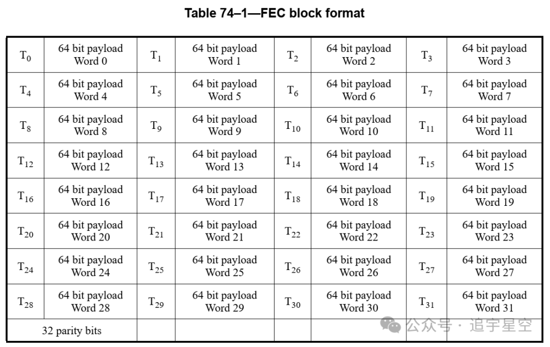 FEC块的格式如表74-1所示。FEC块的长度为2112比特。每个FEC块包含32行,每行65位;64比特的有效载荷和1比特的转码开销(T比特)。在每个块的末尾都有32位开销或奇偶校验位。发送在每行内从左向右,行之间从上到下。有效载荷比特携带来自PCS层的信息符号。FEC块总长度 =(32 × 65)+ 32 = 2112比特。