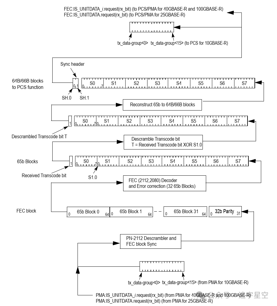 FEC子层不会降低PCS的符号率,也不会增加PMD子层的信令率。相反,FEC子层压缩来自PCS提供的64B/66B编码数据的同步比特,以适应为每个2080比特(32 × 65 = 2080)的块添加32个奇偶校验比特。