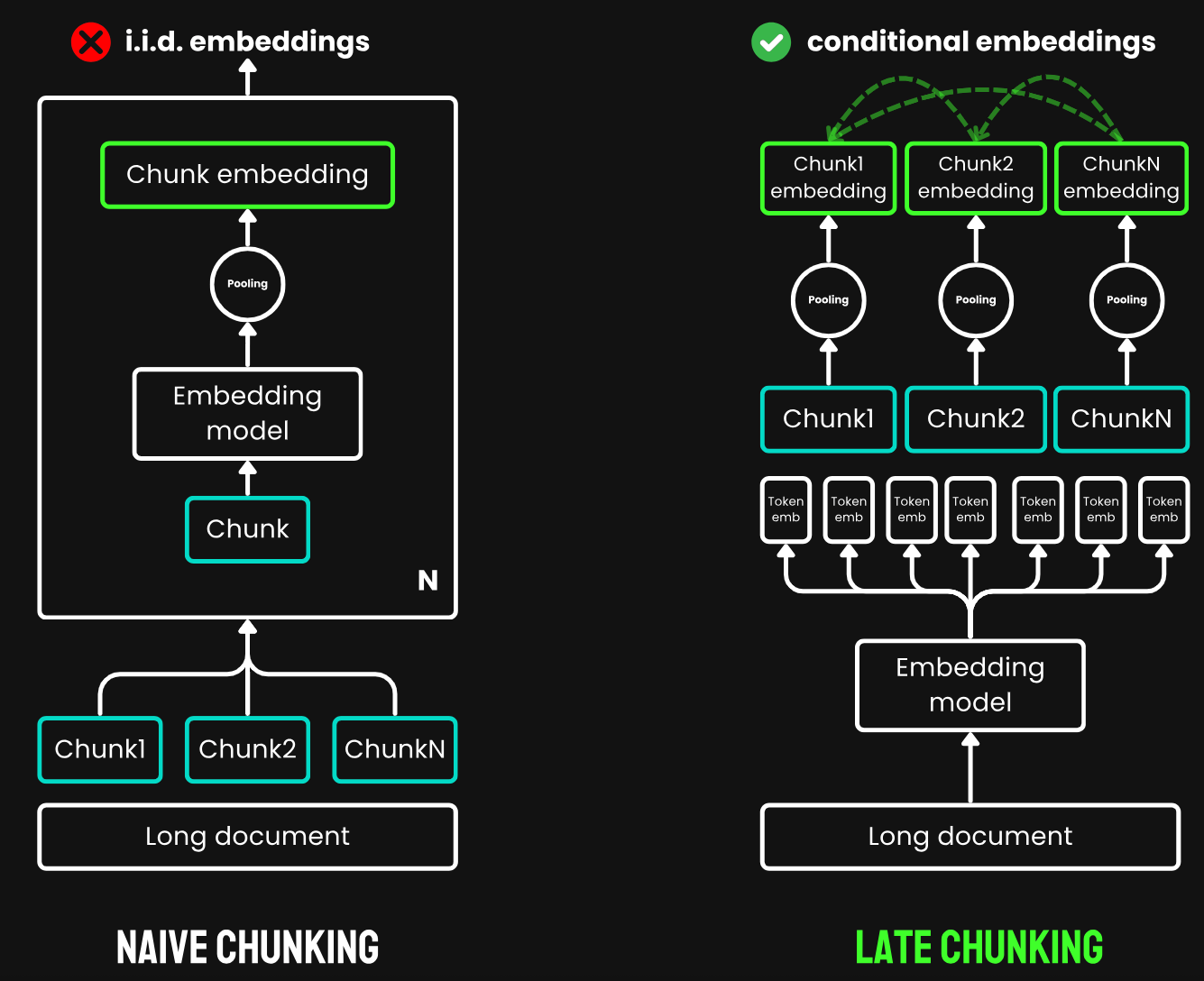 "Late Chunking"方法首先将嵌入模型的 transformer 层应用于整个文本或尽可能多的文本。这会为每个 token 生成一个包含整个文本信息的向量表示序列。随后,对这个 token 向量序列的每个块应用平均池化,生成考虑了整个文本上下文的每个块的嵌入。与生成独立同分布(i.i.d.)块嵌入的朴素编码方法不同,Late Chunking 创建了一组块嵌入,其中每个嵌入都"以"前面的嵌入为条件,从而为每个块编码更多的上下文信息。