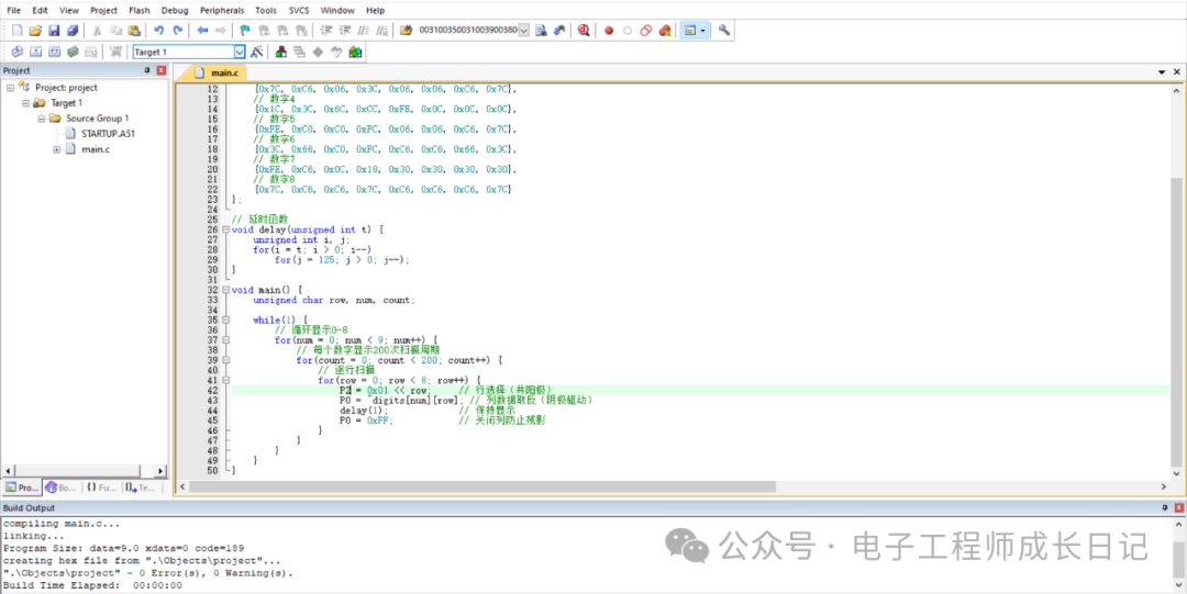 P0 = ~digits[num][row]; // 列数据取反(阴极驱动)