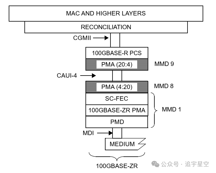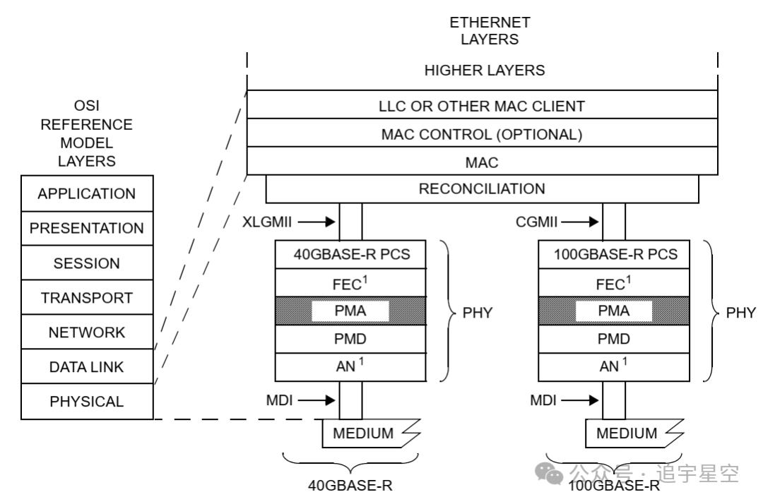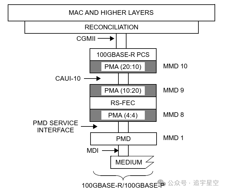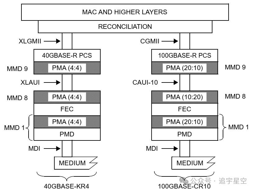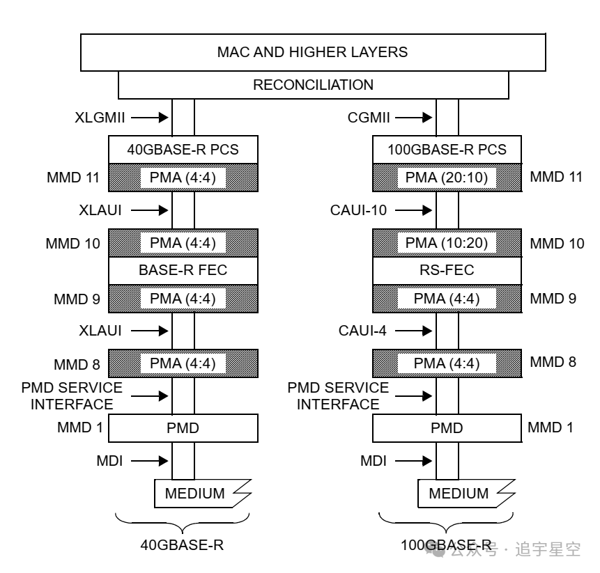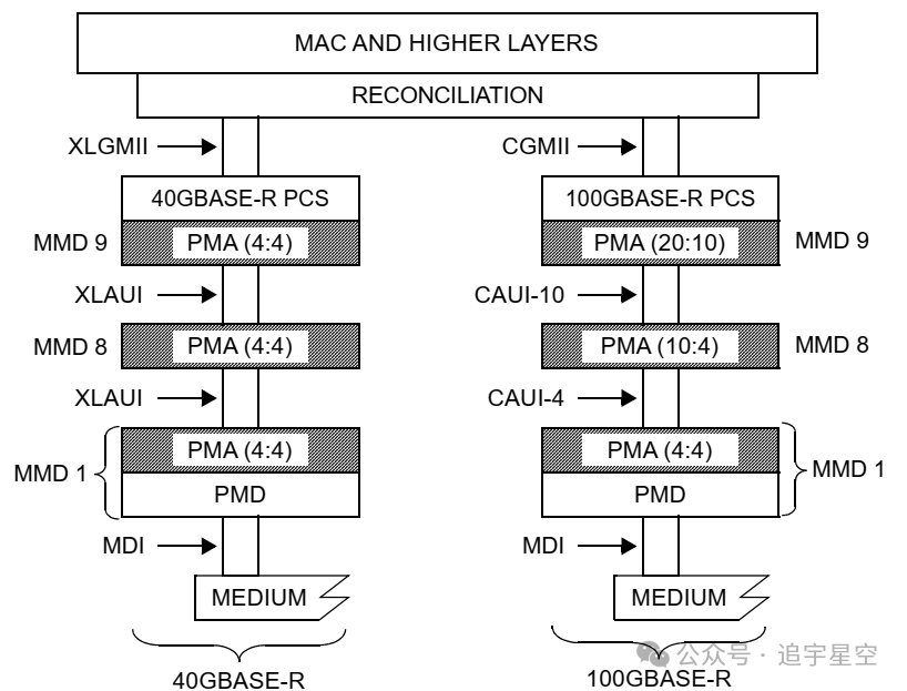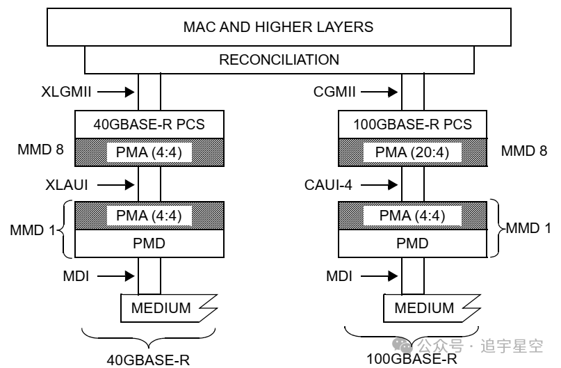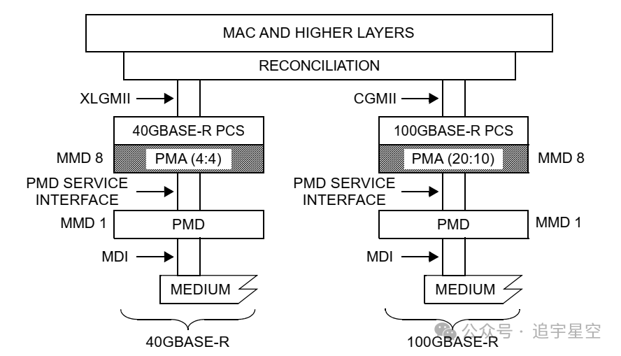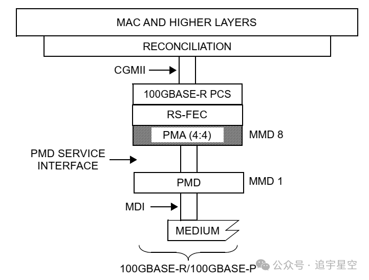 本条款规定了物理介质连接子层(PMA),该子层是40GBASE-R和100GBASE-R两个物理层实现系列(40Gb/s和100Gb/s)所共有的。PMA允许PCS以独立于介质的方式与一系列物理介质连接。40GBASE-R PMA可以支持任何40Gb/s PMD。100GBASE-R PMA可以支持任何100 Gb/s PMD,但不提供100GBASE-KP4 (比较特殊的一种100G PHY)的PMD服务接口。术语40GBASE-R和100GBASE-R通常用于指代使用本条款中定义的PMA的物理层。