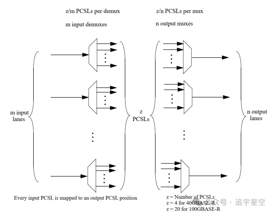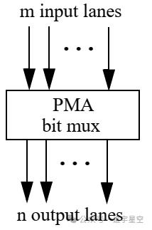从概念上讲,PMA比特复用器通过从m个PMA输入通道中解复用PCSL并将其再复用到n个PMA输出通道中,在一个发送方向上运行。