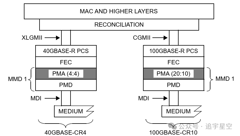 40GBASE-R和100GBASE-R可以扩展到支持任何全双工介质,只需要PMD符合适当的PMA接口。