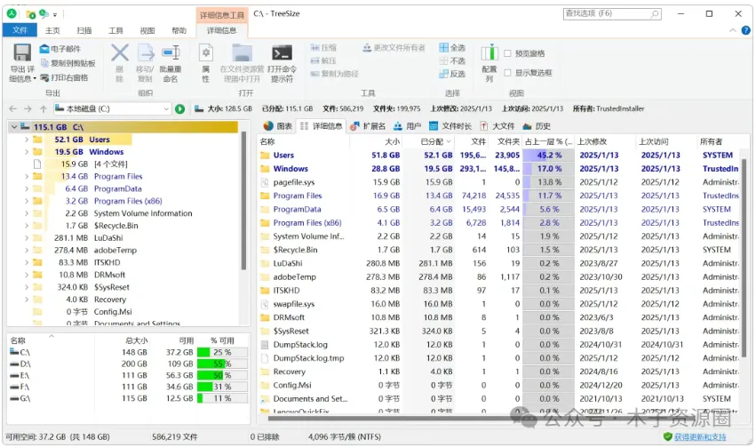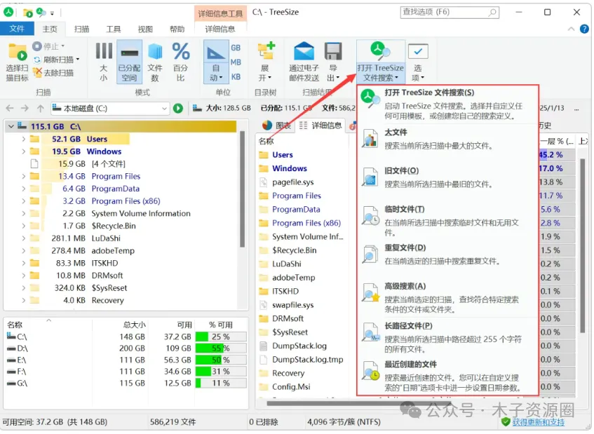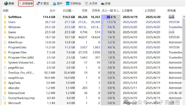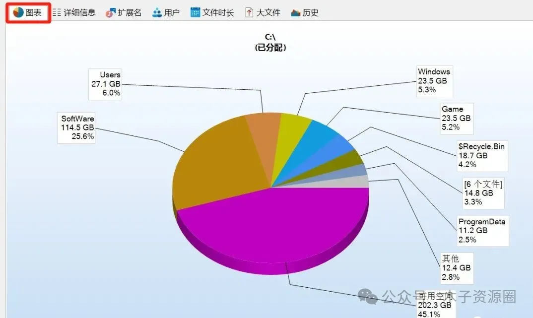 当你选好想要分析的磁盘后,它会用各种各样的方式来做统计分析,像用图表展示、给出详细信息、按照文件扩展名归类、区分不同用户的文件,还有看文件存在的时长等等。它给出的图表特别清楚明白,一下子你就能知道到底是哪个文件夹“吃”掉了最多的磁盘空间。有了这个,我们后面要删除文件或者把文件挪到别的地方去的时候,可就方便太多啦!
