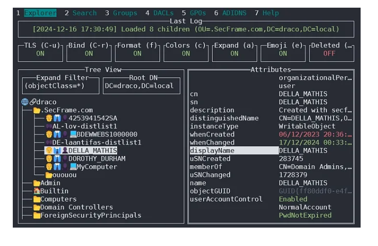 Godap 是 LDAP 的交互式终端用户界面,可用于与 AD 和其他 LDAP 服务器中的对象和属性进行交互。它适用于 Windows、Linux 和 MacOS,支持简单绑定、传递哈希、传递票证和传递证书,以及其他一些特殊功能,例如搜索/创建/更改/删除对象、在组中添加/删除用户、更改密码、编辑对象权限 (DACL)、修改 Active Directory 集成 DNS (ADIDNS)、导出到 JSON 文件等。