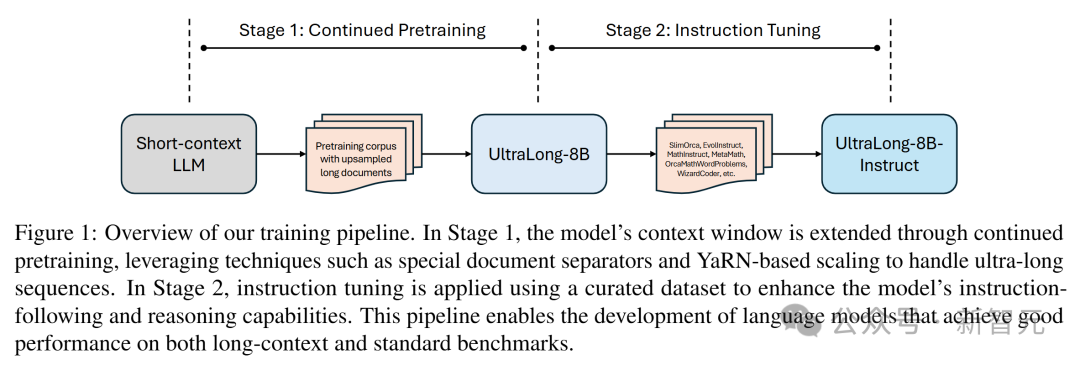 以Llama 3.1-8B-Instruct为基础,持续预训练阶段将模型的上下文窗口逐步扩展到目标长度(比如100万、200万、400万token)。随后,指令微调阶段优化模型的指令遵循能力和推理能力。