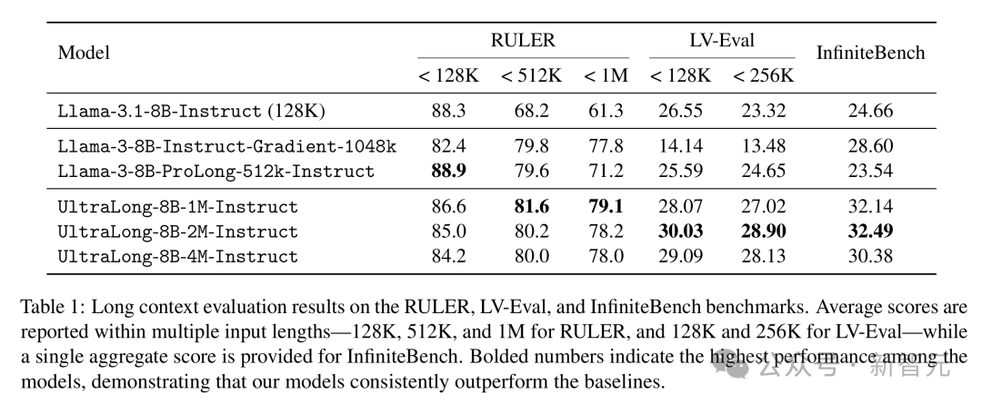 研究者在RULER、LV-Eval和InfiniteBench上的评估结果如表1所示。加粗的数字表示性能超过了所有基准模型。