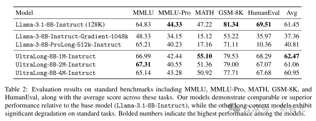 研究人员利用上面方法训练的UltraLong-8B模型在长上下文任务上达到了顶尖水平,同时在标准任务上也保持了竞争力。