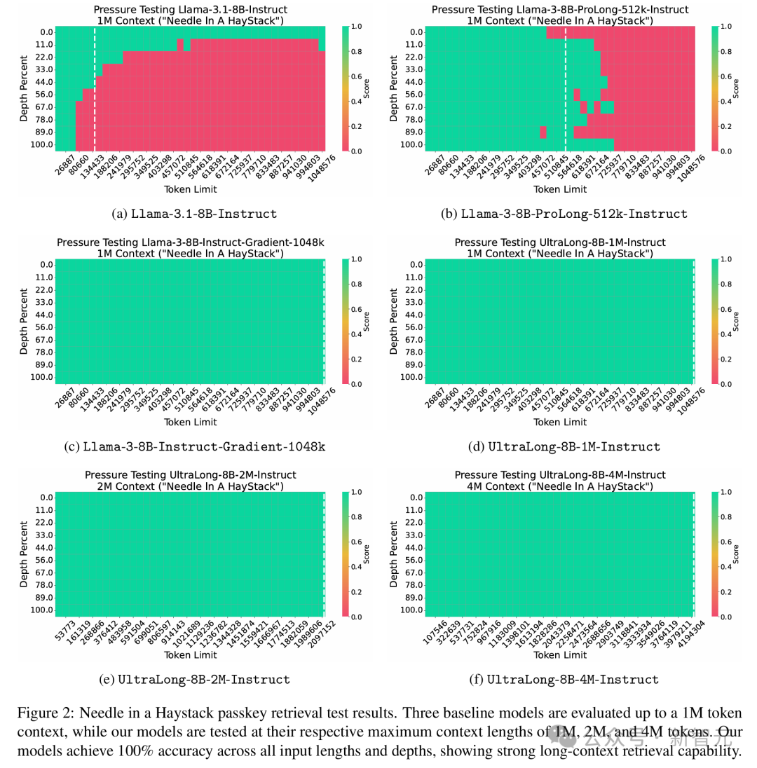 相比之下,如图2d到2f所示,研究者的超长(UltraLong)模型在所有输入长度和深度上都达到了100%的准确率,展现了强大的长上下文检索能力。