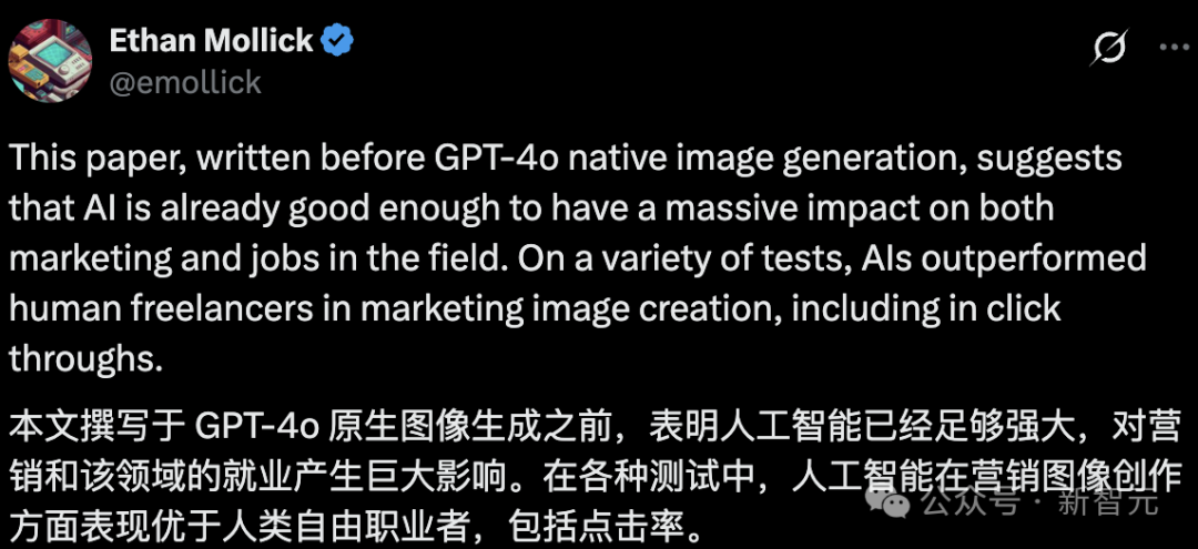 沃顿商学院教授教授Ethan Mollick表示:「GPT-4o的原生图像生成,足以颠覆市场营销行业。AI早已击败人类中的自由职业者。」