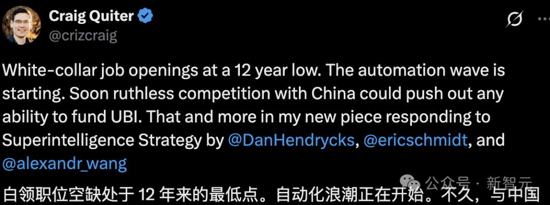 OpenAI前成员、AI工程师Craig Quiter认为AI取代人类岗位的浪潮已经开始,AI将彻底颠覆财富分配格局。