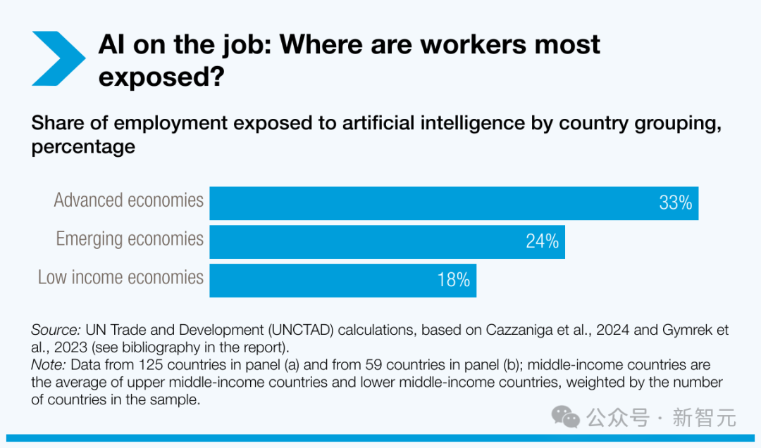 根据联合国贸易和发展会议估计,全球范围内,约40%的工作岗位可能受到冲击,其中发达经济体高达三分之一的职位面临自动化风险。