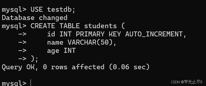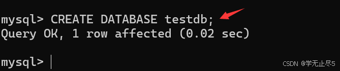 连接到 MySQL 服务器后,我们可以使用 CREATE DATABASE 语句来创建一个新的数据库。例如,创建一个名为 testdb 的数据库: