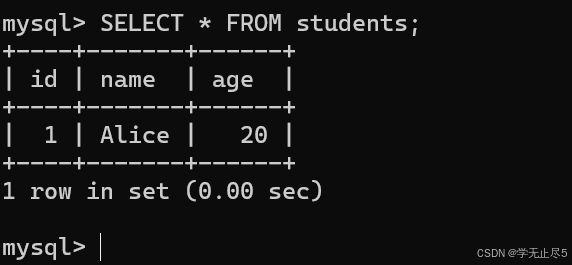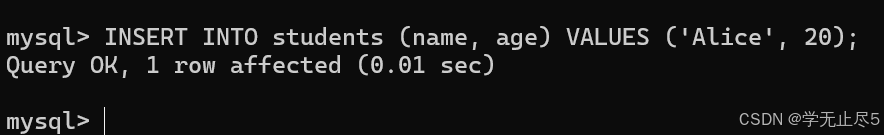 创建表后,我们可以使用 INSERT INTO 语句向表中插入数据。例如,向 students 表中插入一条学生记录: