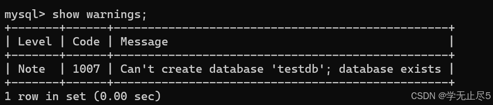 在这里testdb数据库已经存在了,所以报了警告,我们可以使用关键字来查看我们的警告。