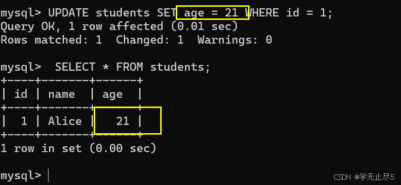 如果需要修改表中的数据,可以使用 UPDATE 语句。例如,将 students 表中 id 为 1 的学生的年龄更新为 21: