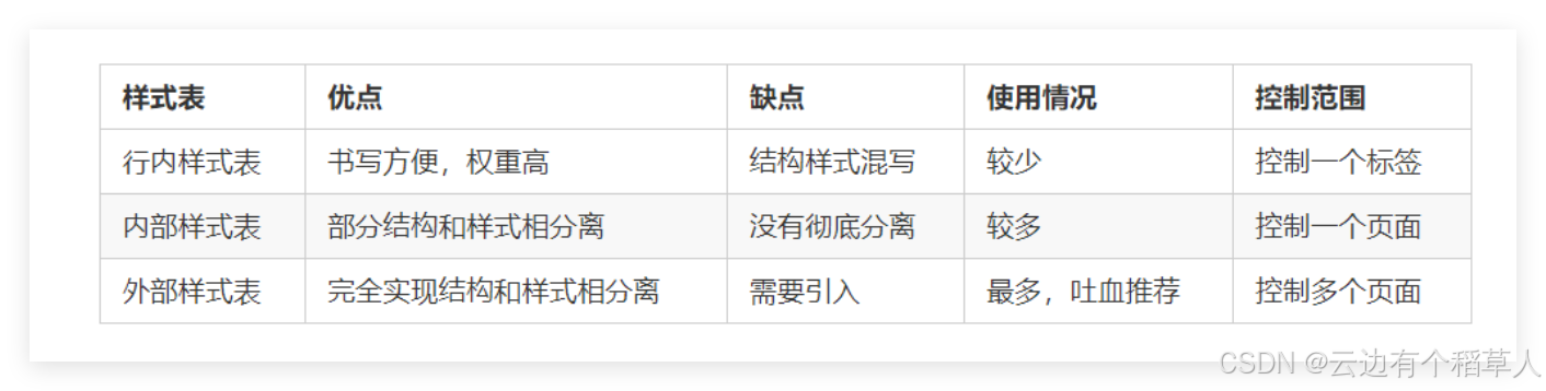 按照 CSS 样式书写的位置(或者引入的方式),CSS 样式表可以分为三大类: