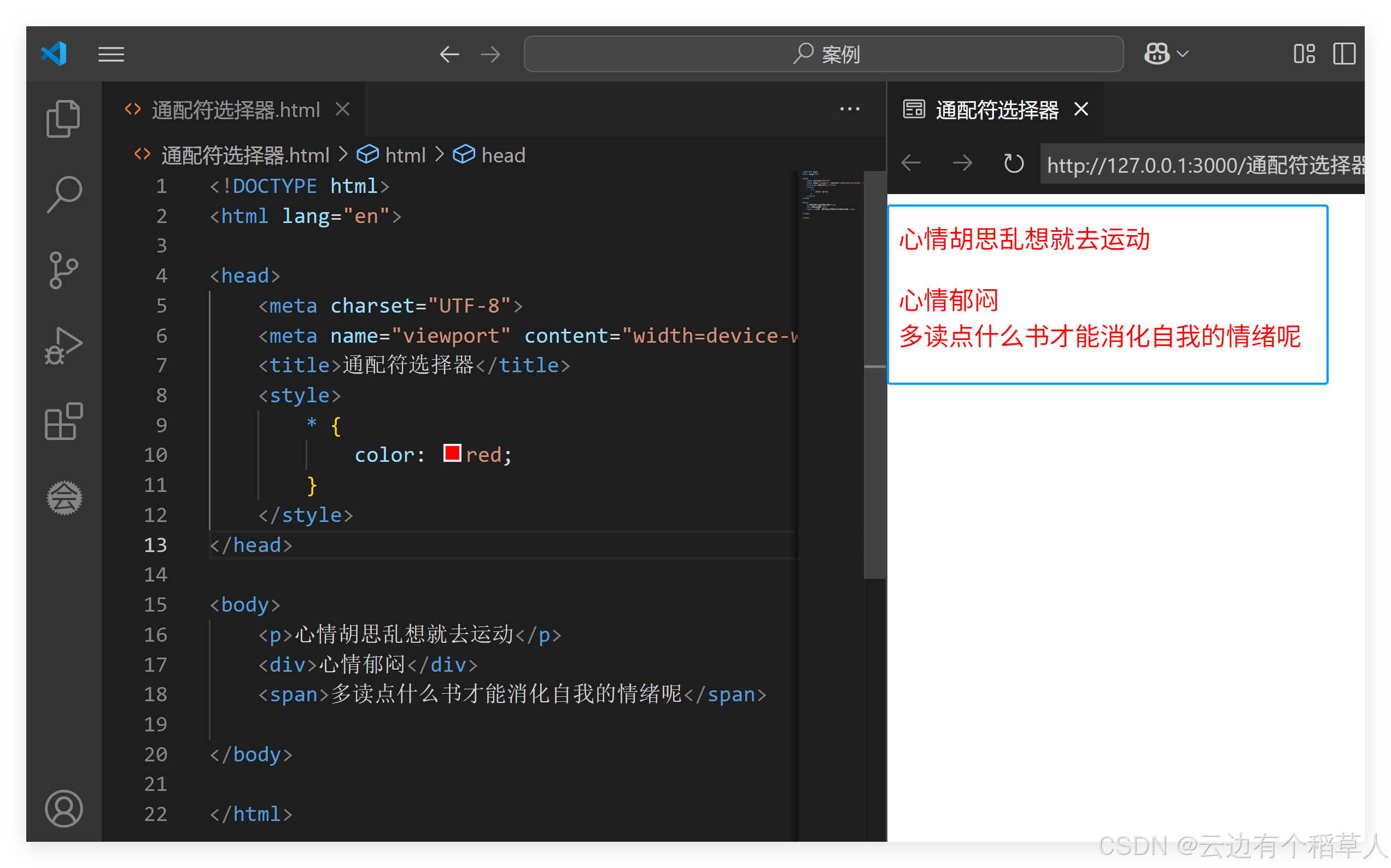 在 CSS 中,通配符选择器使用 “ * ” 定义,它表示选取页面中所有元素(标签),像body标签,head标签,是指所有的标签 。
