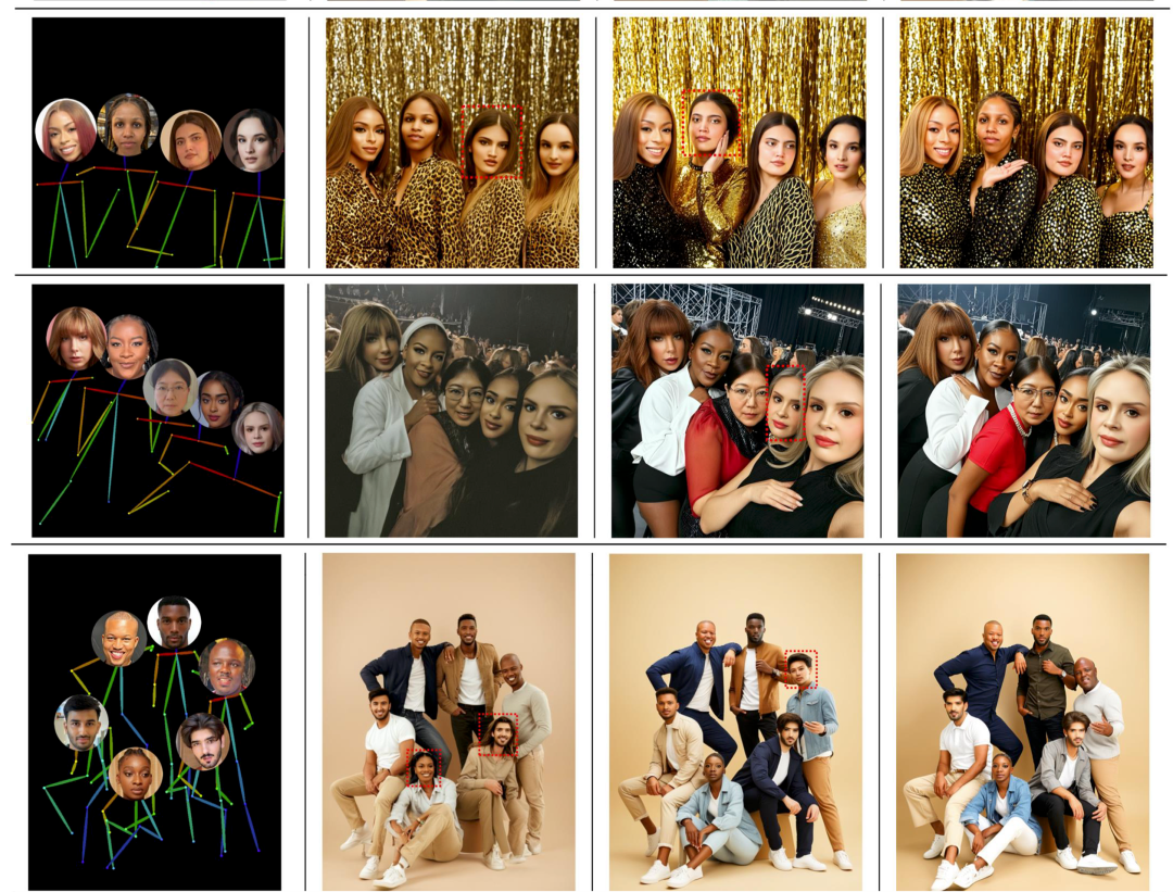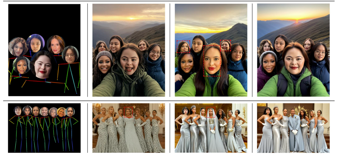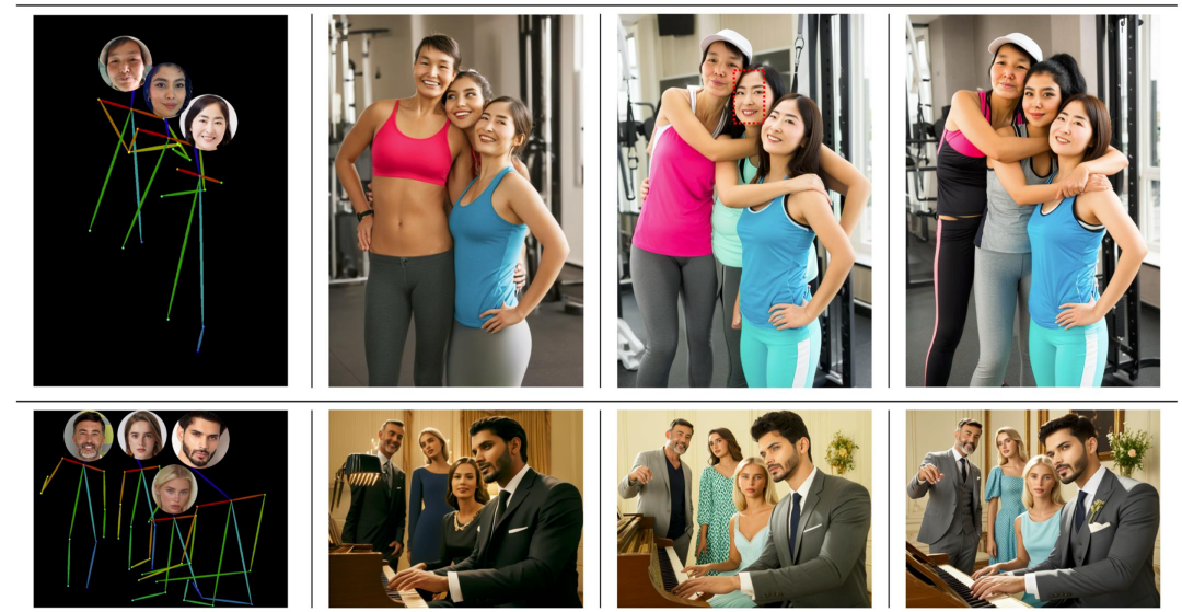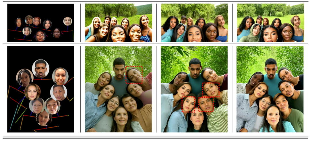 其中最棘手的,就是身份特征泄露(ID leakage)—— 明明是两个人,却因为特征混淆,生成出面容 “融合” 的人脸,令人难以分辨谁是谁。更进一步,用户往往还希望可以精确指定每个人的位置和动作,实现更自然真实的构图和创意有趣的互动。可一旦位置错乱,原本的故事就变了味儿。