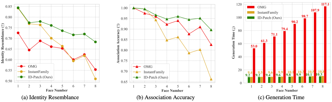值得注意的是,随着图中人脸数量的增加,OMG 和 InstantFamily 出现了明显的性能下降,主要由于 ID 泄露问题加剧;而 ID-Patch 的表现更为稳健,虽然也存在一定下降,但幅度较小。这种下降主要是由于人脸数量增多后,单张人脸在图像中的面积缩小,进而影响了 SDXL 模型对小脸部特征的还原效果。同时,更多人脸的存在也对面部特征提取提出更高的需求,因此会略微增加生成时间。