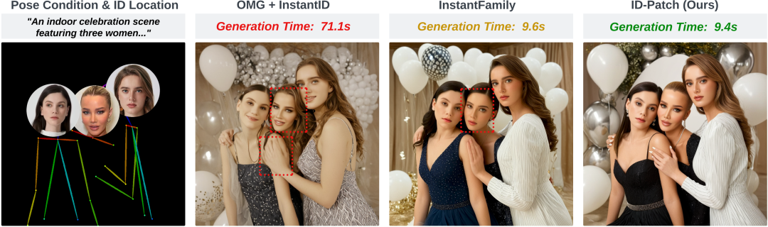 如图表所示,ID-Patch 在身份还原 (identity resemblance) 与身份 - 位置匹配 (association accuracy) 两个核心指标上表现出色,分别达到了 0.751 和 0.958,充分体现出其在保持人物面部一致性和精确放置方面的强大能力。在文本对齐(text alignment)方面,各方法表现相近,差异不显著。而在生成效率上,ID-Patch 是所有方法中最快的!