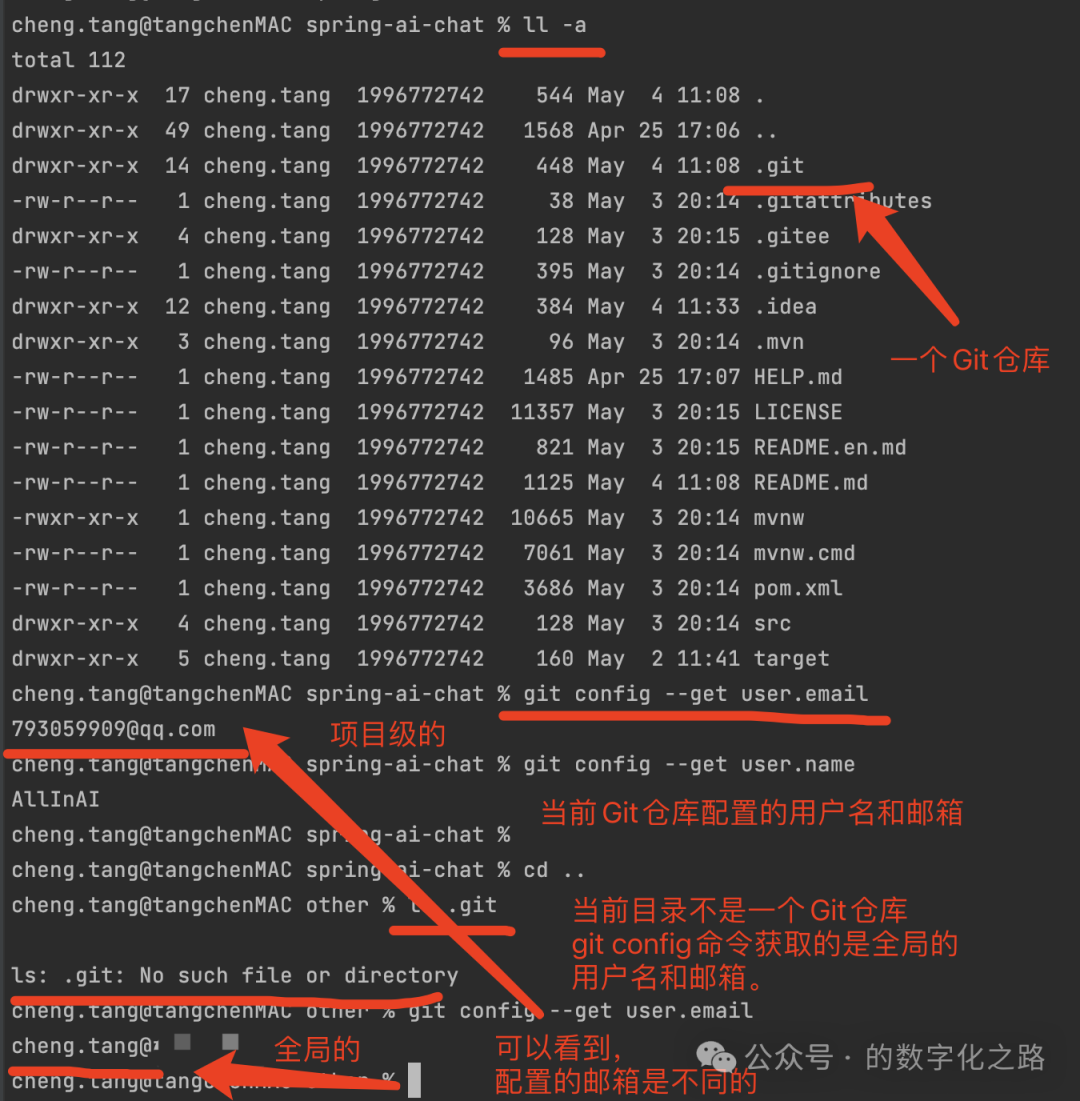 这两个命令用于设置或获取当前Git配置的用户名称和电子邮件地址。这些设置对于Git的许多功能至关重要,因为它们用于标识谁进行了提交。