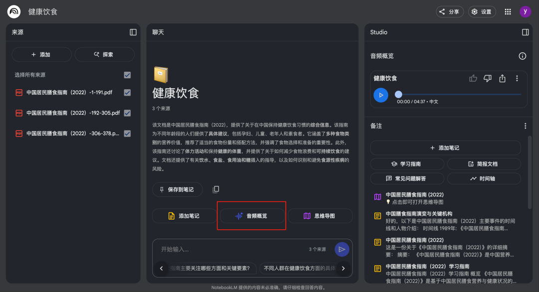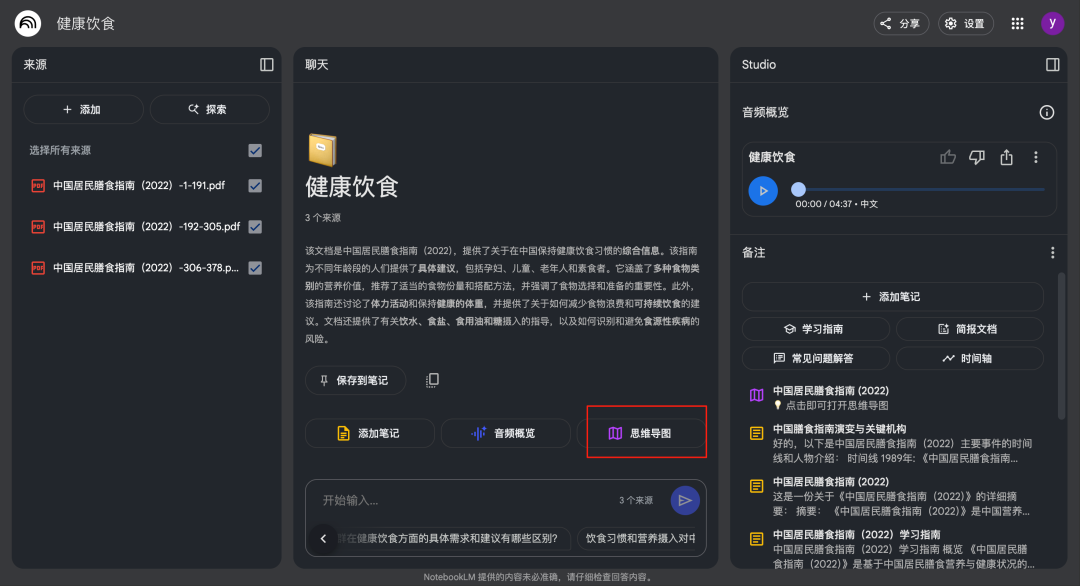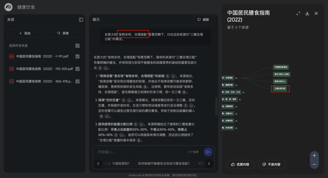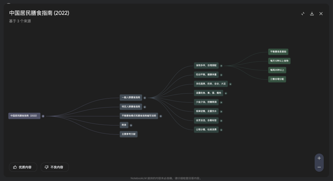 NotebookLM 生成的思维导图它会将知识点分成三个层级,以《中国居民膳食指南 (2022)》为例,它从【一般人群膳食指南】->【食物多样,合理搭配】->【三餐分配合理】,知识点层层递进。