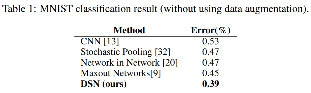 需要特别说明的是,本框架可兼容近期提出的多种先进技术,如模型平均、dropconnect 和 Maxout 等。论文表示通过对 DSN 的精细化工程优化,可进一步降低分类误差。
