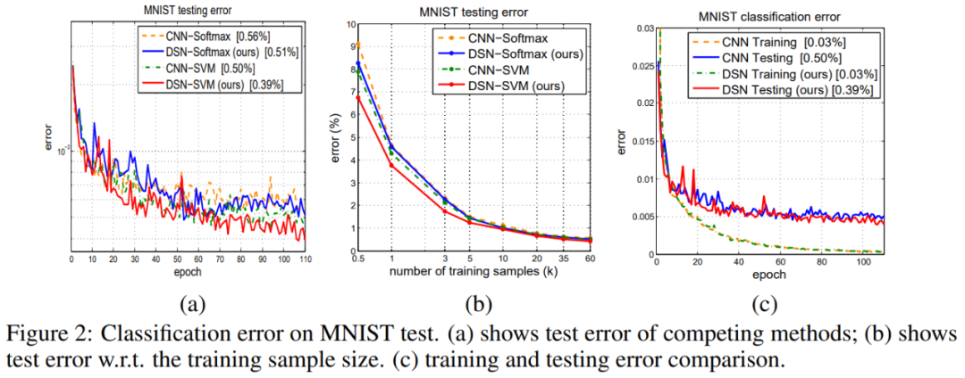 图 2 (a) 和 (b) 展示了四种方法的结果,DSN-Softmax 和 DSN-SVM 优于它们的竞争 CNN 算法。图 2 (b) 显示了针对不同大小的训练样本进行训练时不同方法的分类误差(在 500 个样本时,DSN-SVM 比 CNN-Softmax 提高了 26%)。图 2 (c) 显示了 CNN 和 DSN 之间的泛化误差比较。