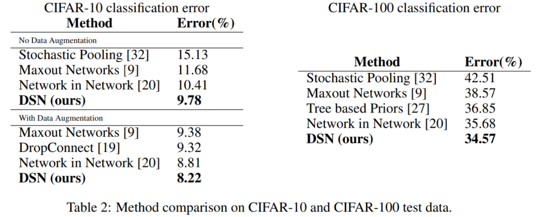 表 2 显示,在 CIFAR-10 和 CIFAR-100 上的性能提升,再次证明了 DSN 方法的优势。