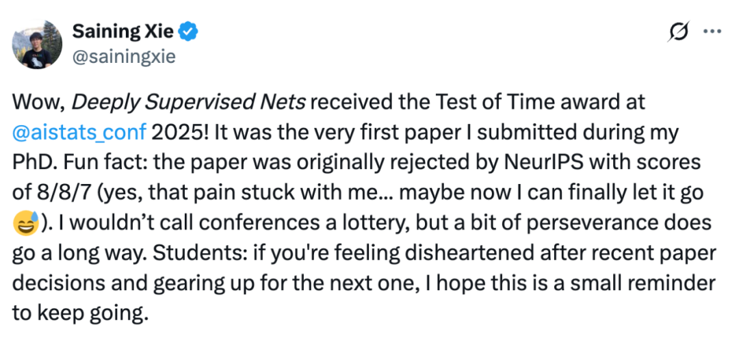 在得知自己 10 年前的论文获得 AISTATS 2025 时间检验奖之后,谢赛宁分享了更多背后的故事。