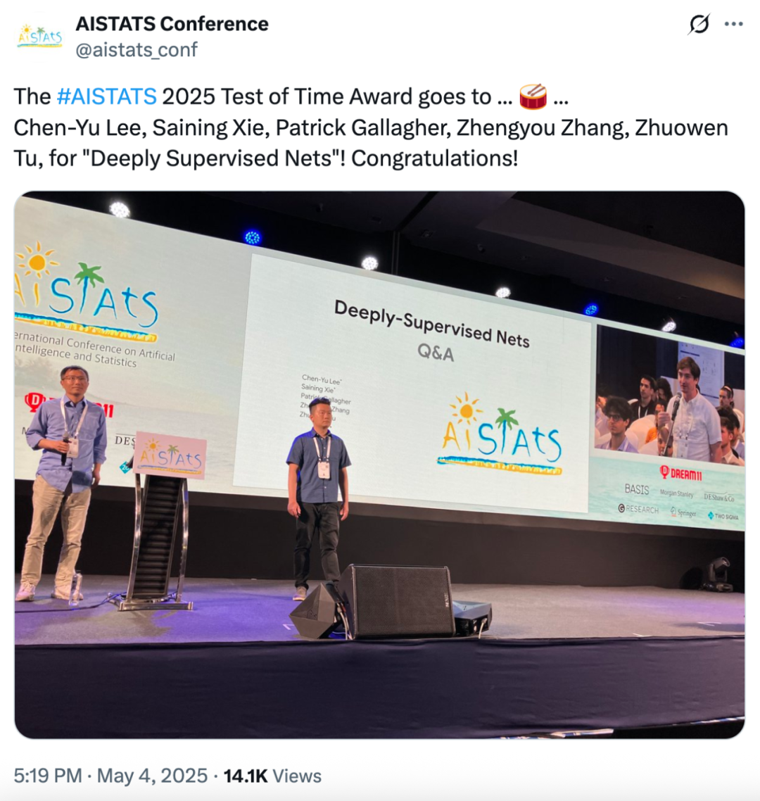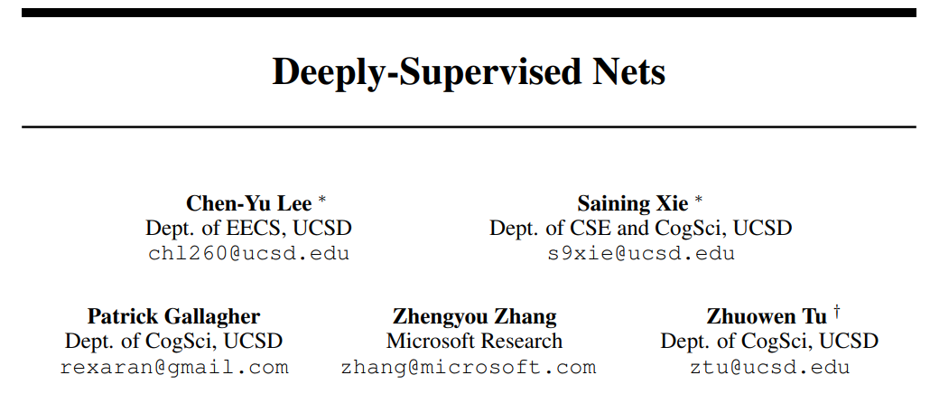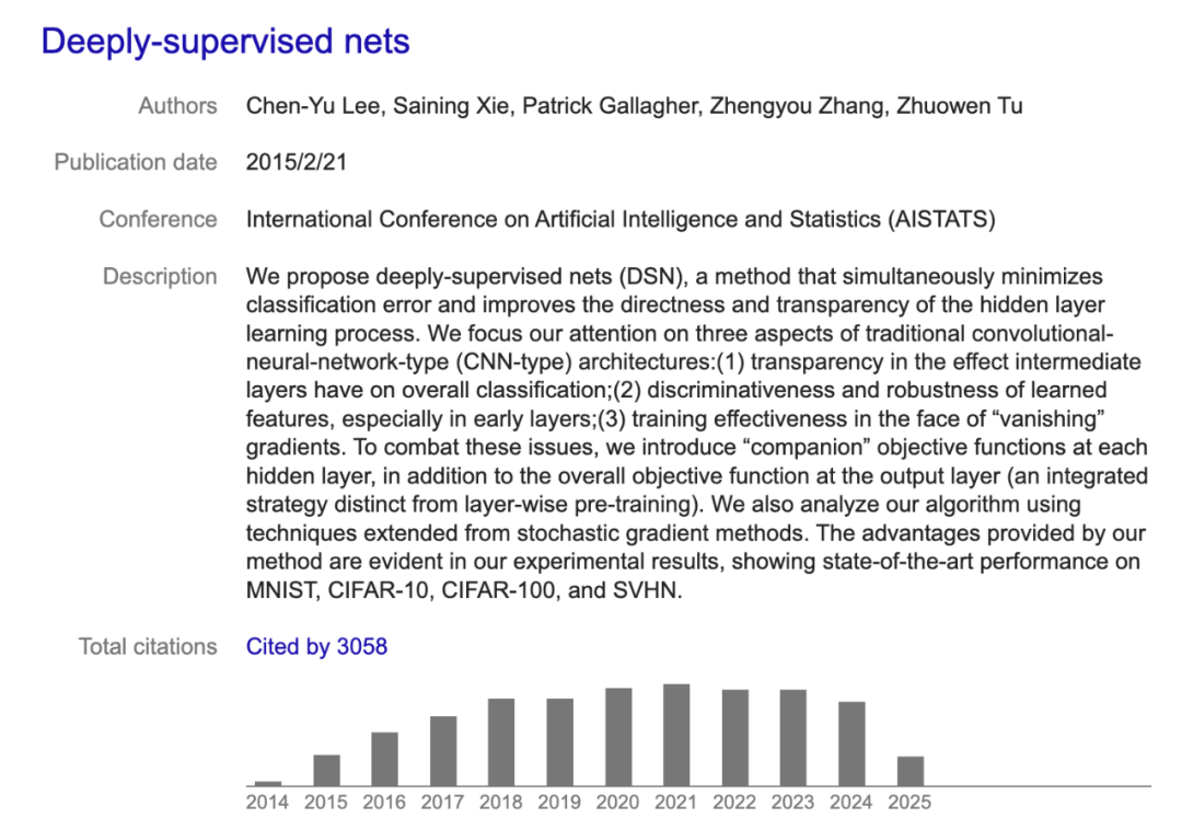 昨日,会议主办方公布了本年度时间检验奖,授予 UCSD 与微软研究院合著的论文《Deeply-Supervised Nets》(深度监督网络),共同一作分别为 Chen-Yu Lee(现为谷歌研究科学家)和 AI 圈所熟知的谢赛宁(现为纽约大学助理教授)。论文通讯作者为 UCSD 屠卓文教授,他也是谢赛宁和 Chen-Yu Lee 的博士导师。该论文被当年的 AISTATS 接收。