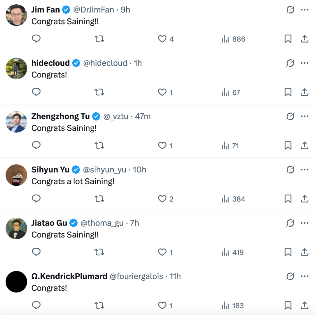 评论区的网友纷纷发来对谢赛宁论文获奖的祝贺。