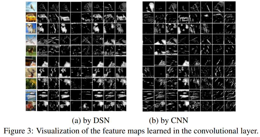 为了比较 DSN 与 CNN 分别学习到什么特征,本文从 CIFAR-10 数据集的十个类别中各选取一个示例图像,运行一次前向传播,并在图 (3) 中展示从第一个(底部)卷积层学习到的特征图。每个特征图仅显示前 30% 的激活值。DSN 学习到的特征图比 CNN 学习到的特征图更直观。