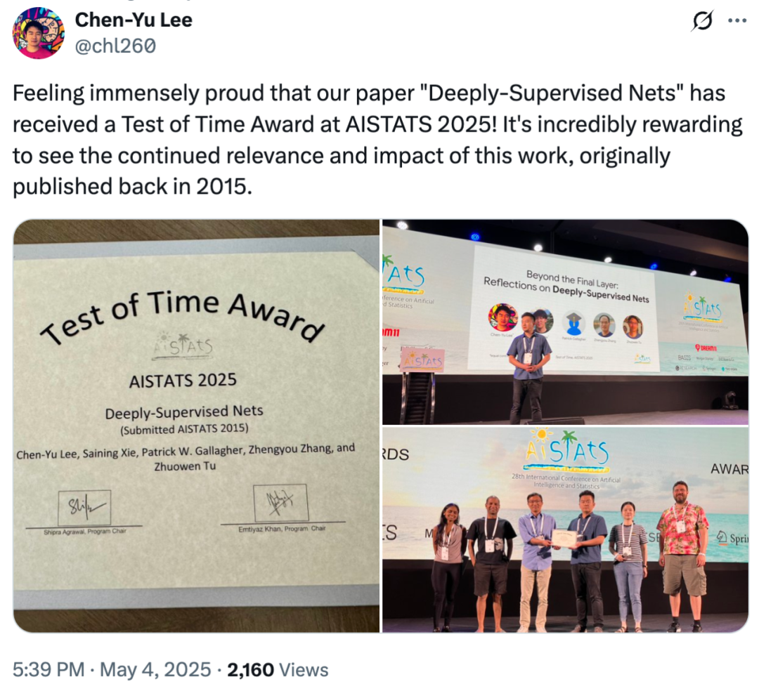 同样地,另外一位共同一作 Chen-Yu Lee 也发文对 10 年前的论文获得 AISTATS 2025 时间检验奖感到自豪,并表示这项研究成果至今仍具有重要意义和影响力。