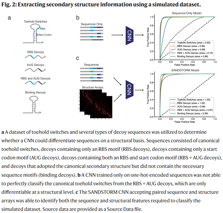 研究人员使用包含Toehold开关与若干干扰序列的模拟数据集,评估CNN将结构数组转化为可解释结构信息的能力。Toehold开关是一类核糖调控元件,其通过与互补RNA输入分子的结合,调控下游蛋白的翻译。由于该装置需要特定的序列和结构才能发挥作用,因而成为评估序列-结构联合输入模型性能提升的理想示例。该数据集包含标准Toehold开关以及四类干扰序列,分别为:仅包含RBS和随机序列;仅包含起始密码子;同时包含RBS和起始密码子但结构不符合Toehold开关特征;具备Toehold结构但缺乏必要序列模体的序列。
